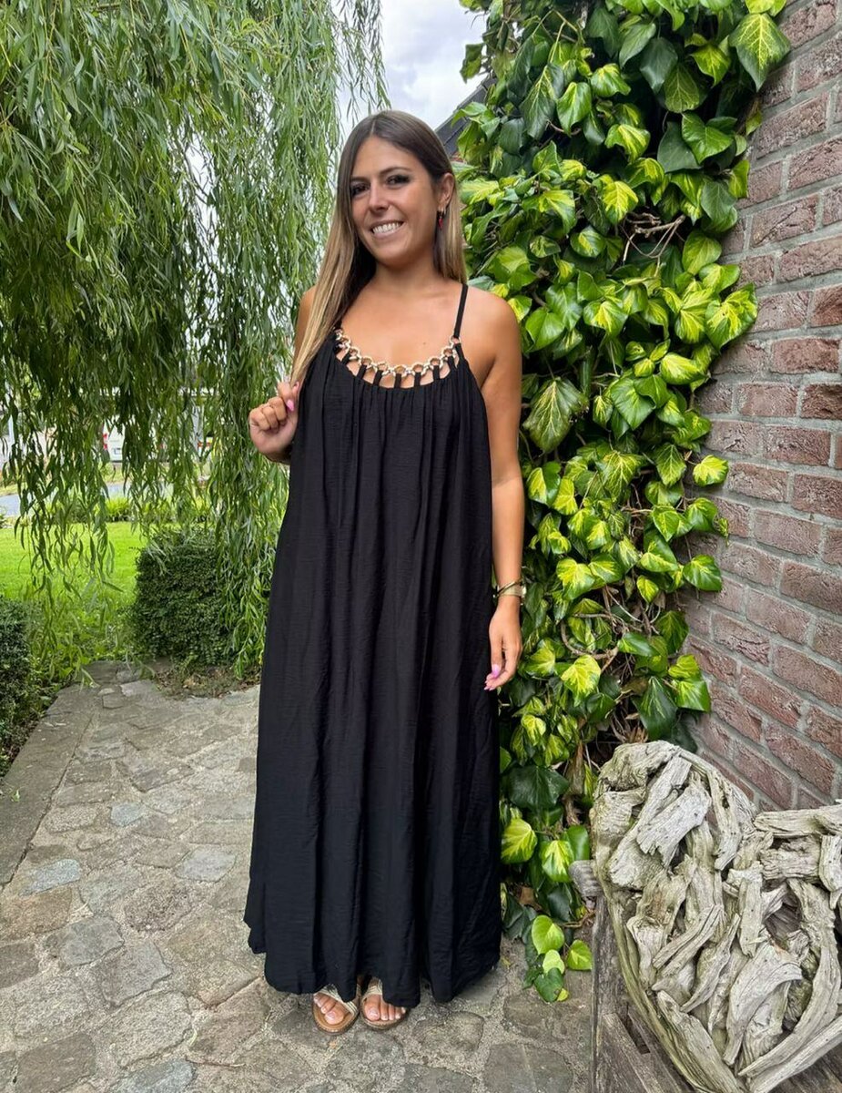 Cette robe longue noire est parfaite pour toutes les occasions. Avec son design fluide et son décolleté orné, elle vous garantit élégance et confort. Idéale pour une soirée d'été ou un événement formel.