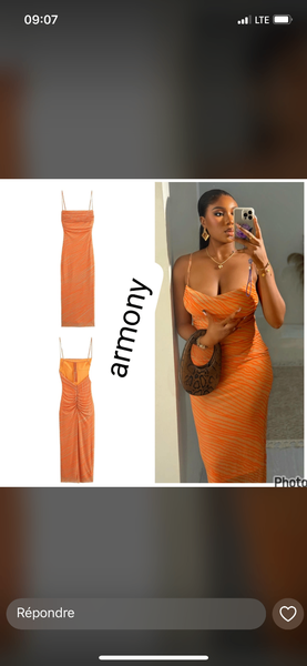 Élégante robe orange moulante en tulle à épaules dénudées et jupe à volants. Parfaite pour une soirée ou un événement spécial. Confortable et chic.