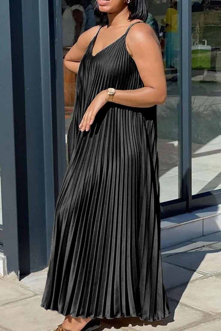 Cette robe plissée noire est le choix parfait pour toute occasion spéciale. Avec sa conception sans manches et son tissu fluide, elle offre style et confort. Idéale pour les cocktails, dîners ou soirées estivales, elle mettra en valeur votre silhouette tout en vous gardant à l'aise. Un indispensable pour toute garde-robe élégante.