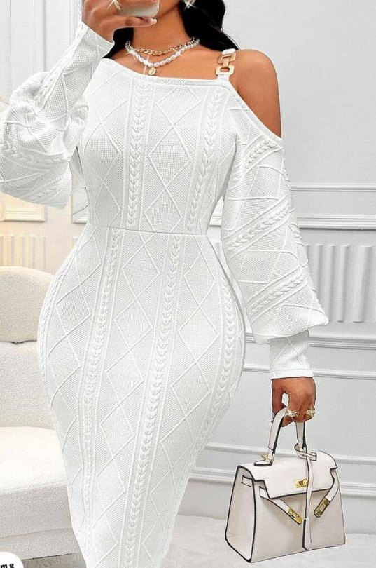 Découvrez une élégance intemporelle avec cette robe pull blanche moulante dotée d'une épaule dénudée et de manches longues. Parfait pour les occasions spéciales ou les sorties quotidiennes, ce design en tricot est à la fois confortable et séduisant. Idéale pour l'hiver, elle deviendra un élément clé de votre garde-robe.