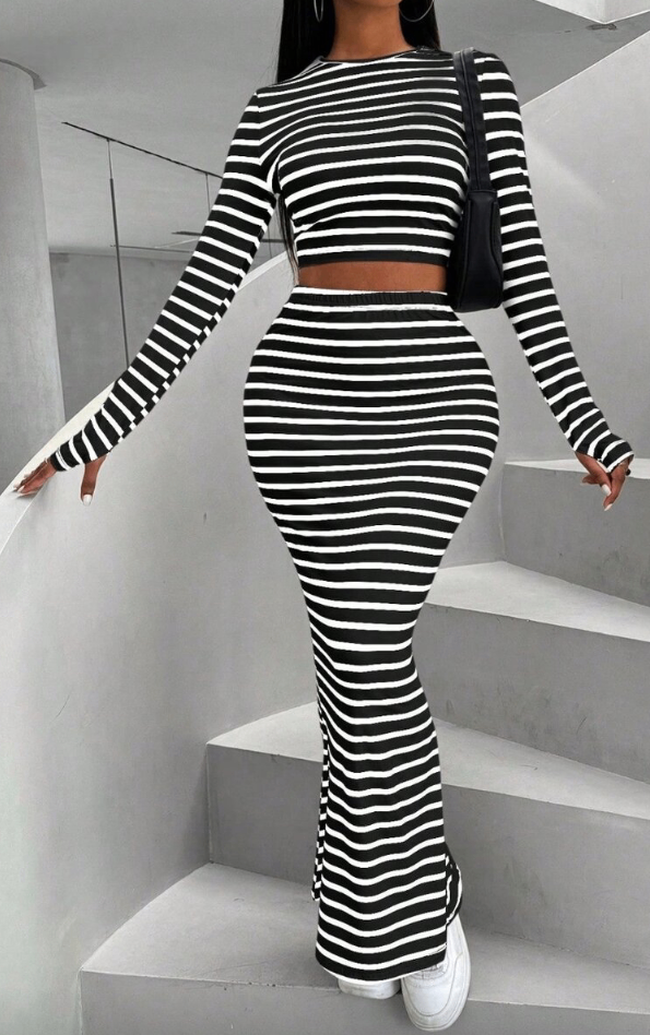 Cette robe longue rayée est idéale pour les sorties chics et décontractées. Avec son design ajusté et ses manches longues, elle offre confort et style. Parfaite pour un look moderne et séduisant, elle s'adapte à toutes les occasions.