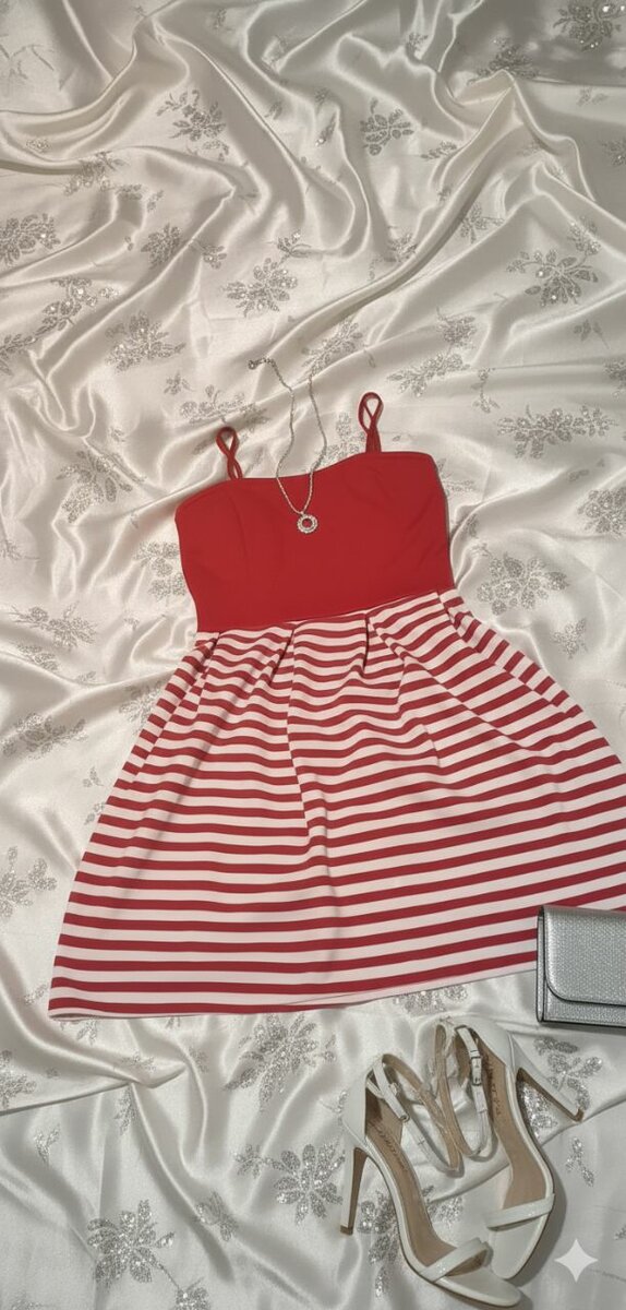 Cette robe rayée rouge et blanche est parfaite pour toutes les occasions spéciales. Avec ses bretelles fines et son design flatteur, elle vous mettra en valeur avec élégance. Idéale pour une soirée d'été ou un événement chic, elle peut être assortie à des talons et des accessoires subtils pour un look complet.