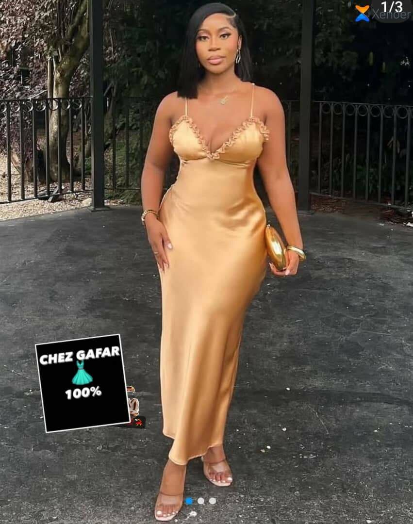 Cette robe satinée dorée est parfaite pour les soirées spéciales. Conçue pour mettre en valeur votre silhouette avec ses fines bretelles et son décolleté délicat. Idéale pour un look glamour et sophistiqué. Portez-la avec des accessoires dorés pour un style éblouissant.