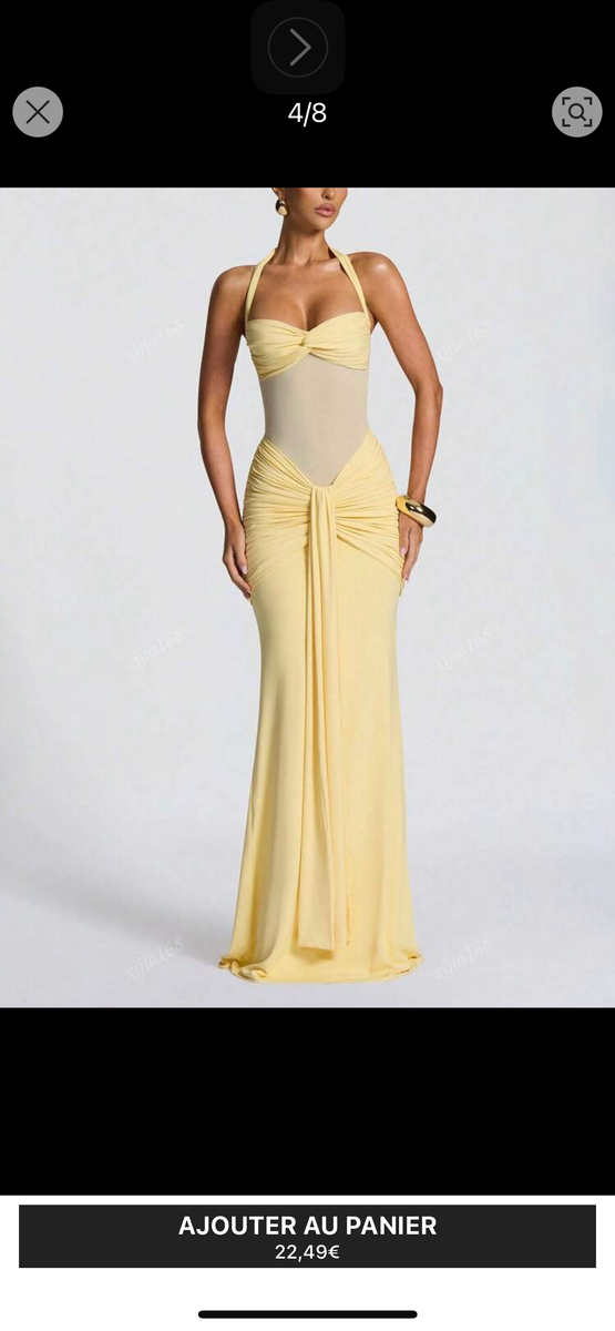 Découvrez cette robe jaune évasée au design distinctif, parfaite pour les soirées ou événements spéciaux. Sa coupe présente un détail de drapé élégant qui accentue la silhouette. Fabriquée dans un tissu léger et respirant, elle garantit confort et élégance. Idéale pour sublimer votre style avec une touche de glamour en toute occasion.
