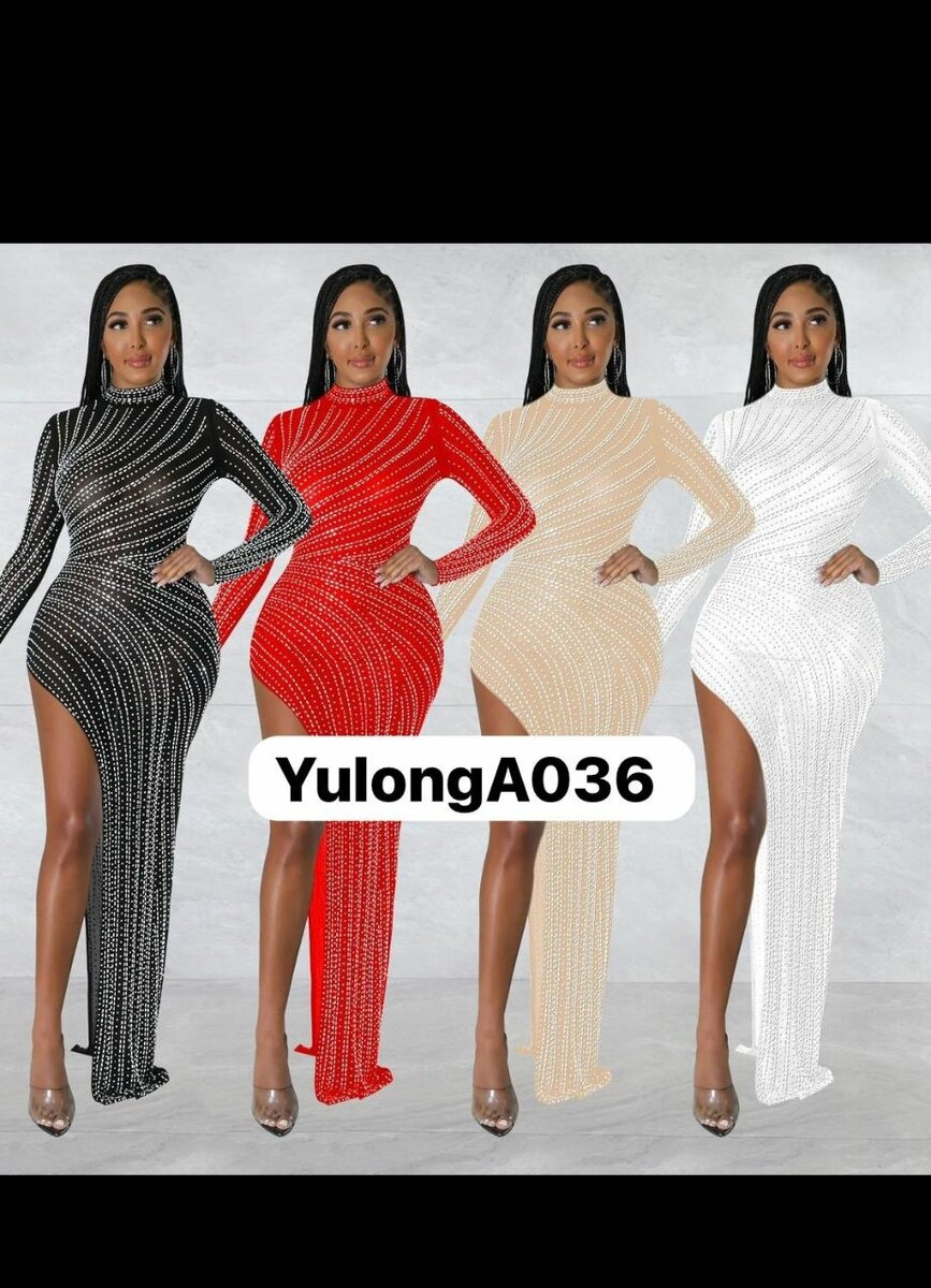 Ravissante robe de soirée avec détails pailletés, disponible en plusieurs couleurs. Fente haute et coupe ajustée pour un look glamour assuré. Idéale pour événements spéciaux.