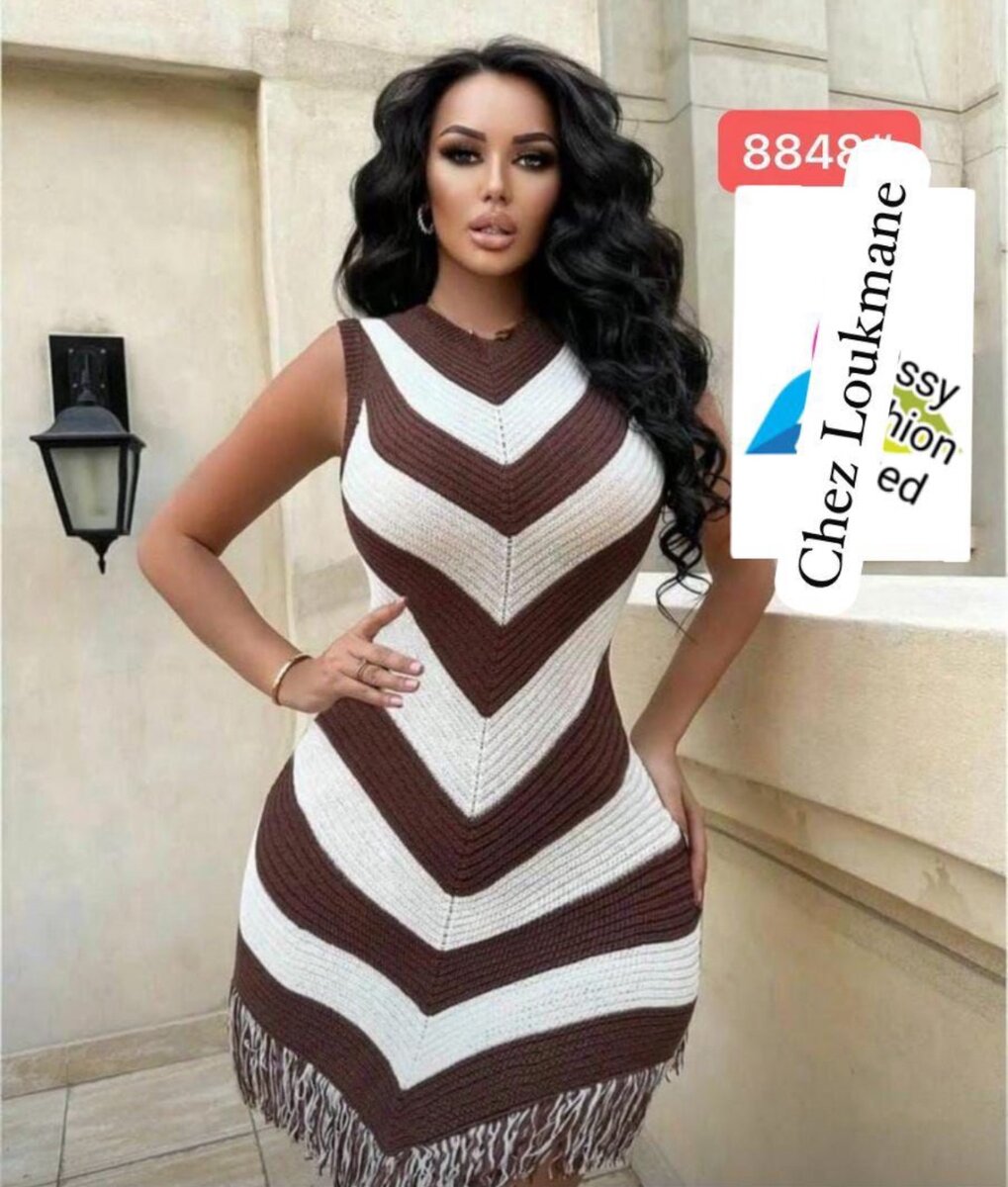 Découvrez notre robe tricot élégante, idéale pour les occasions spéciales. Cette robe met en valeur votre silhouette avec son motif à chevrons marron et blanc. Les détails en franges ajoutent une touche unique et sophistiquée. Parfaite pour les soirées ou événements décontractés-chics.