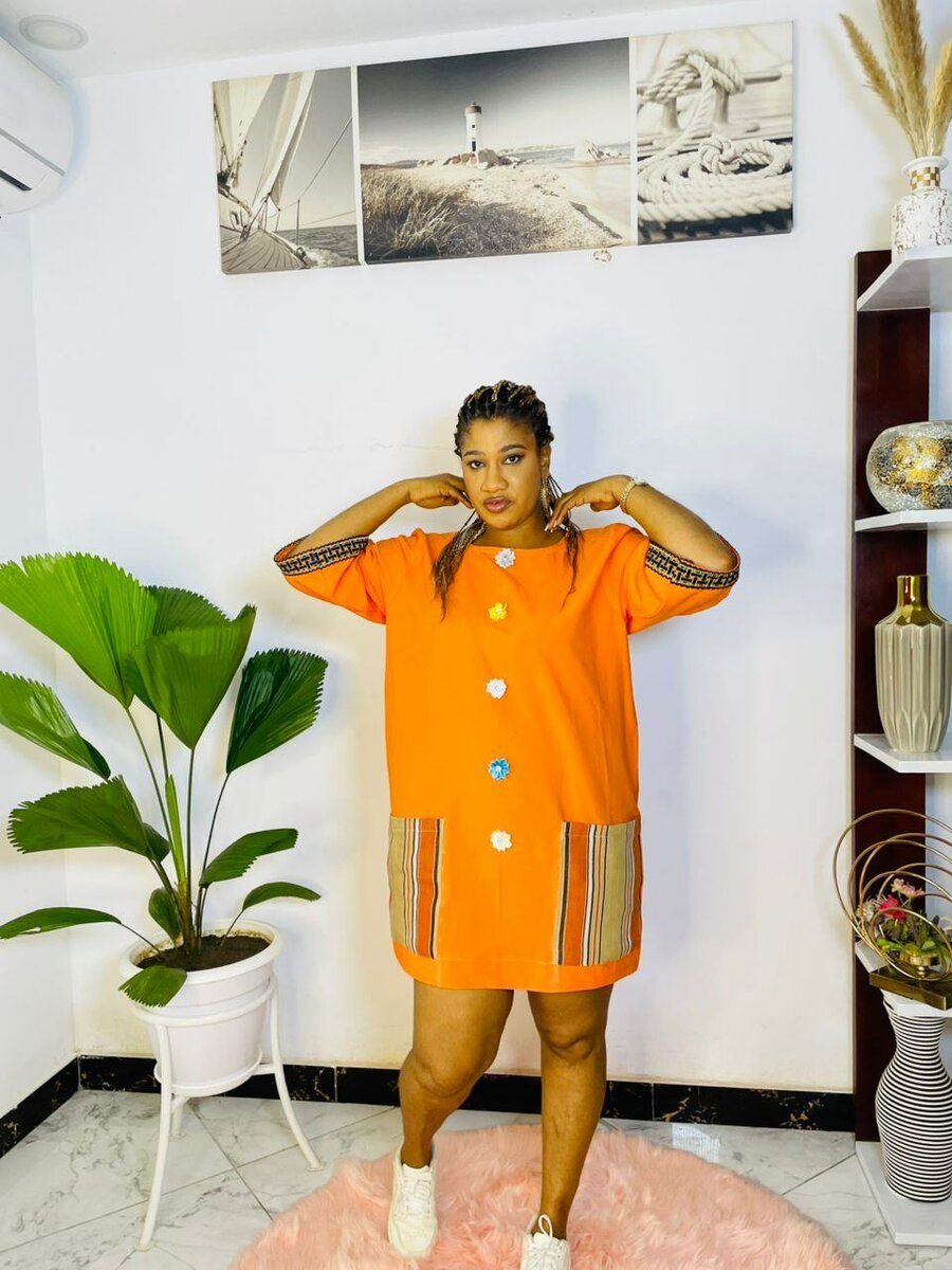 Robe tunique orange vif avec boutons décoratifs et poches à motifs ethniques. Confortable et chic, parfaite pour un look décontracté ou festif. Idéale pour toutes les morphologies grâce à sa coupe ample.