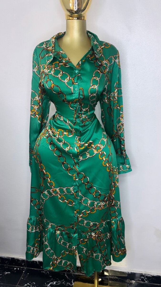 Cette robe verte élégante est faite de soie de haute qualité avec des motifs dorés. Parfaite pour des occasions spéciales, elle combine confort et style. Sa coupe ajustée et sa longueur midi la rendent idéale pour toutes les femmes cherchant à se démarquer.