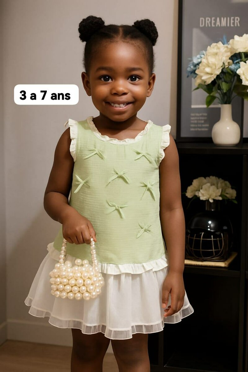 Charmante robe avec noeuds pour filles de 3 à 7 ans. Idéale pour les occasions spéciales ou le quotidien. Confortable et élégante avec jupe en tulle. Un choix parfait pour un look adorable.