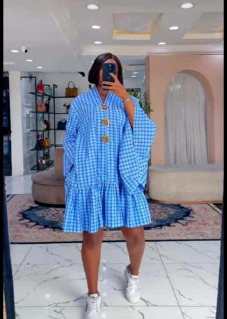 Robe élégante en vichy bleu avec manches larges et boutons dorés. Parfaite pour un look estival chic et décontracté. Tissu léger et confortable, idéal pour les journées chaudes. Combinez-la avec des baskets pour un style moderne et décontracté ou ajoutez des talons pour une touche sophistiquée.