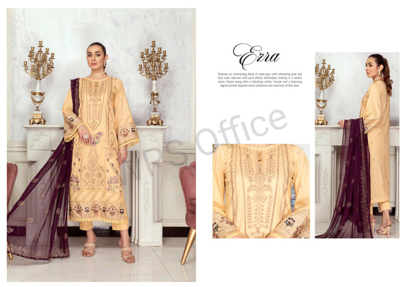 *Pre-booking start now* *MUKESH BY AALAYA* *premium embriderd lawn shirt with luxury crinkel mukesh work dupatta and comfort plane trousers* *10 Design 1 color each* *10 suite Box* Detail: