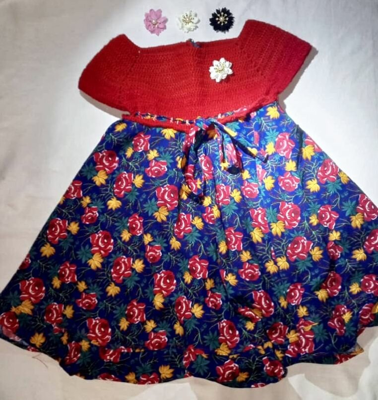 Robe mi- laine (pour le haut) fait à la maison au crochet et mi-tissu pour le bas disponible pour Petites filles de tout âge (2 à 15000)