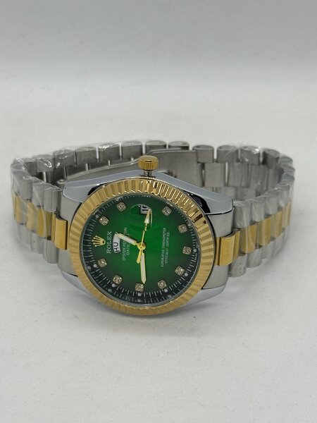Rolex homme. Deux tons doré/argenté, cadran vert unique, style moderne. Etat : Neuf.