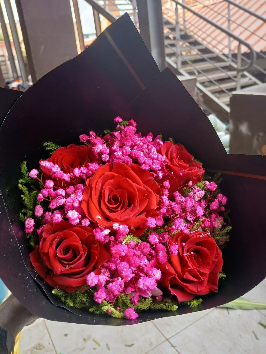 Bouquet de roses rouges avec gypsophile
