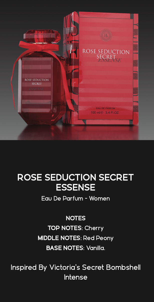 Découvrez le parfum envoûtant Rose Seduction Secret pour femmes. Avec des notes séduisantes de cerise, de pivoine rouge et de vanille, ce parfum est parfait pour chaque occasion. Inspiré par le glamour intemporel.