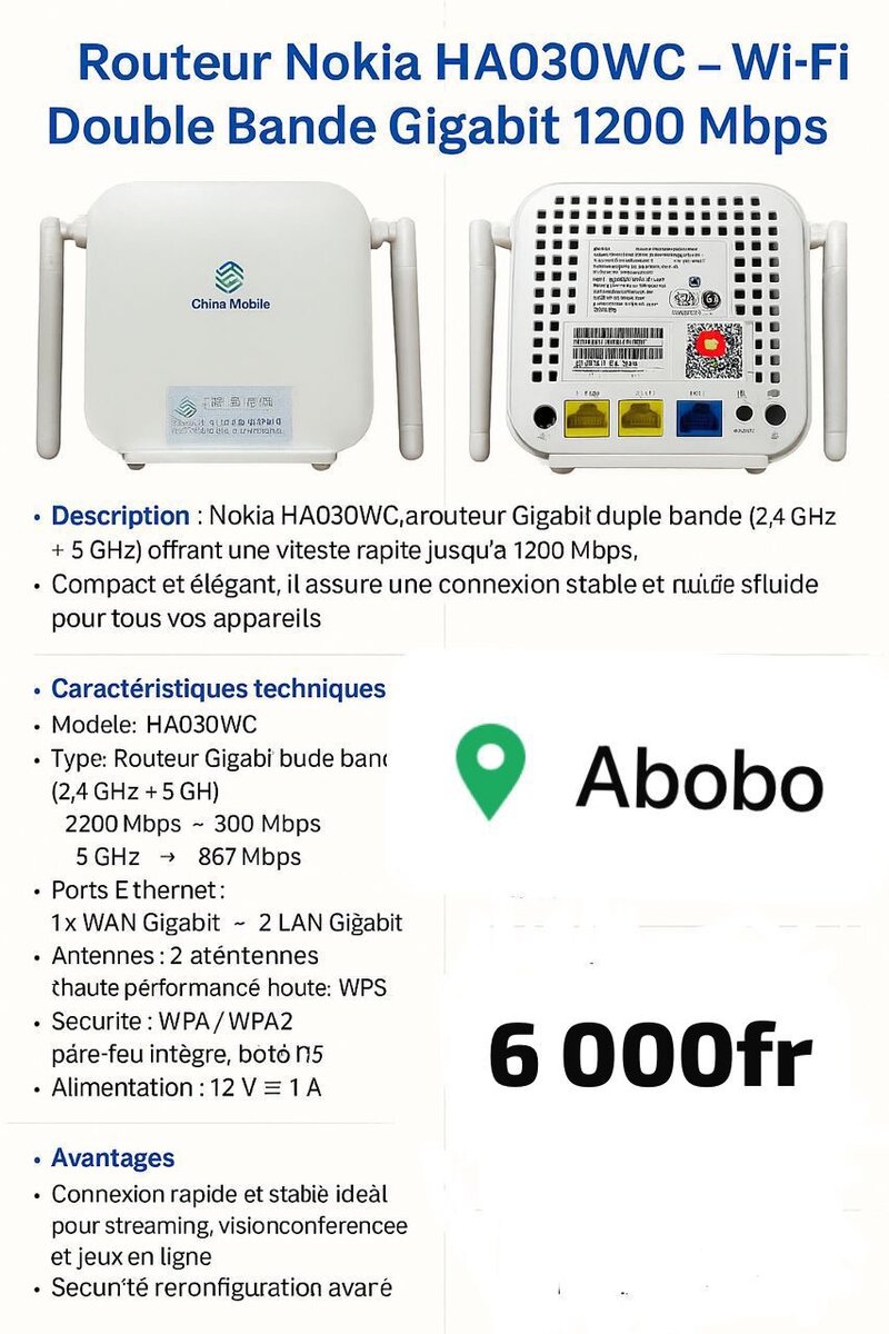 Routeur Nokia HA030WC, double bande (2,4 GHz + 5 GHz), offrant une vitesse jusqu'à 1200 Mbps. Compact, élégant, idéal pour un réseau stable à domicile. Sécurisé avec WPA/WPA2. Interfaces chinois