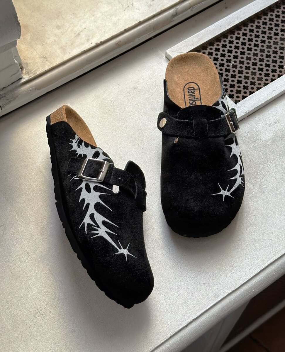 Découvrez ces sabots en daim noir ornés de motifs éclatants, idéals pour un look à la fois chic et confortable. Parfaits pour les sorties décontractées ou pour ajouter une touche d'originalité à votre tenue quotidienne. Confort et style réunis!