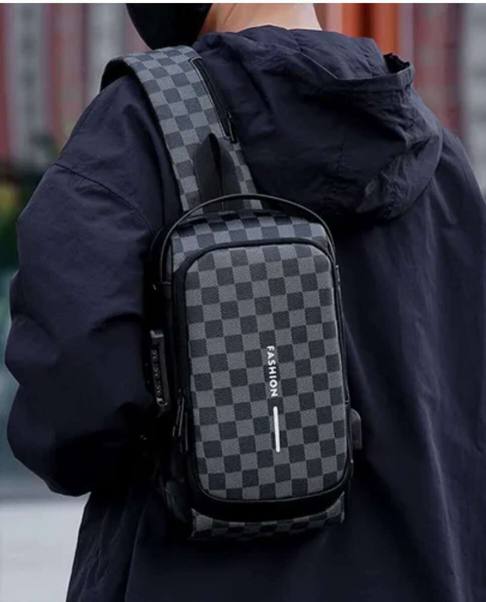 Sac à bandoulière tendance pour homme, design à carreaux gris et noir, plusieurs compartiments, confortable et pratique. Idéal pour les déplacements quotidiens.