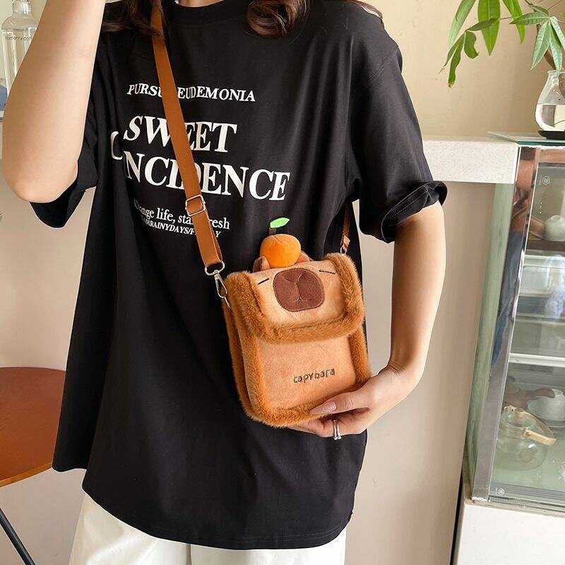 Découvrez ce sac à bandoulière adorable en forme de capybara. Parfait pour ajouter une touche ludique à votre tenue quotidienne. Fabriqué avec une texture douce et accentué par un charmant pompon orange. Idéal pour les sorties décontractées ou pour les amoureux des animaux. Pratique, léger et facile à assortir pour tout âge.