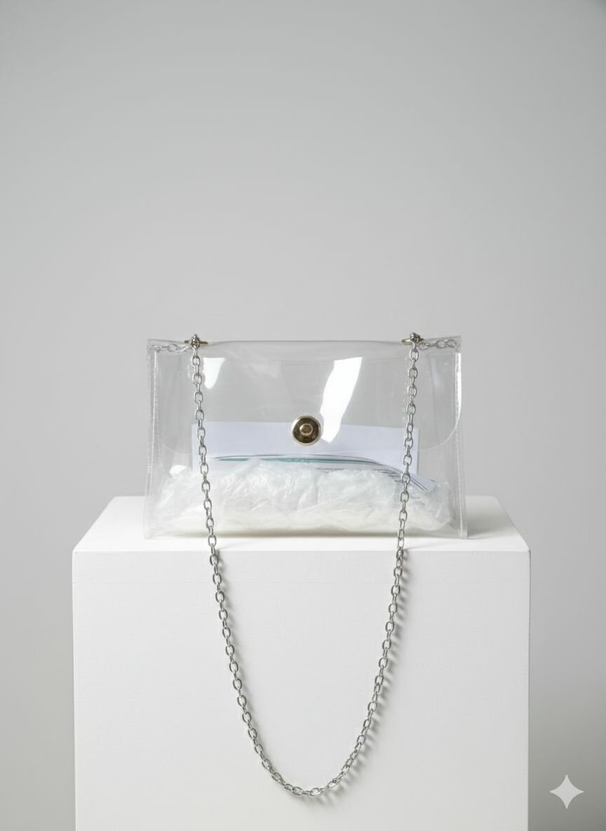 Ajoutez une touche moderne à votre tenue avec ce sac à bandoulière transparent. Sa chaîne élégante et son design épuré en font l'accessoire parfait pour vos sorties. Léger et pratique, idéal pour garder vos essentiels à portée de main lors d'événements ou de soirées.