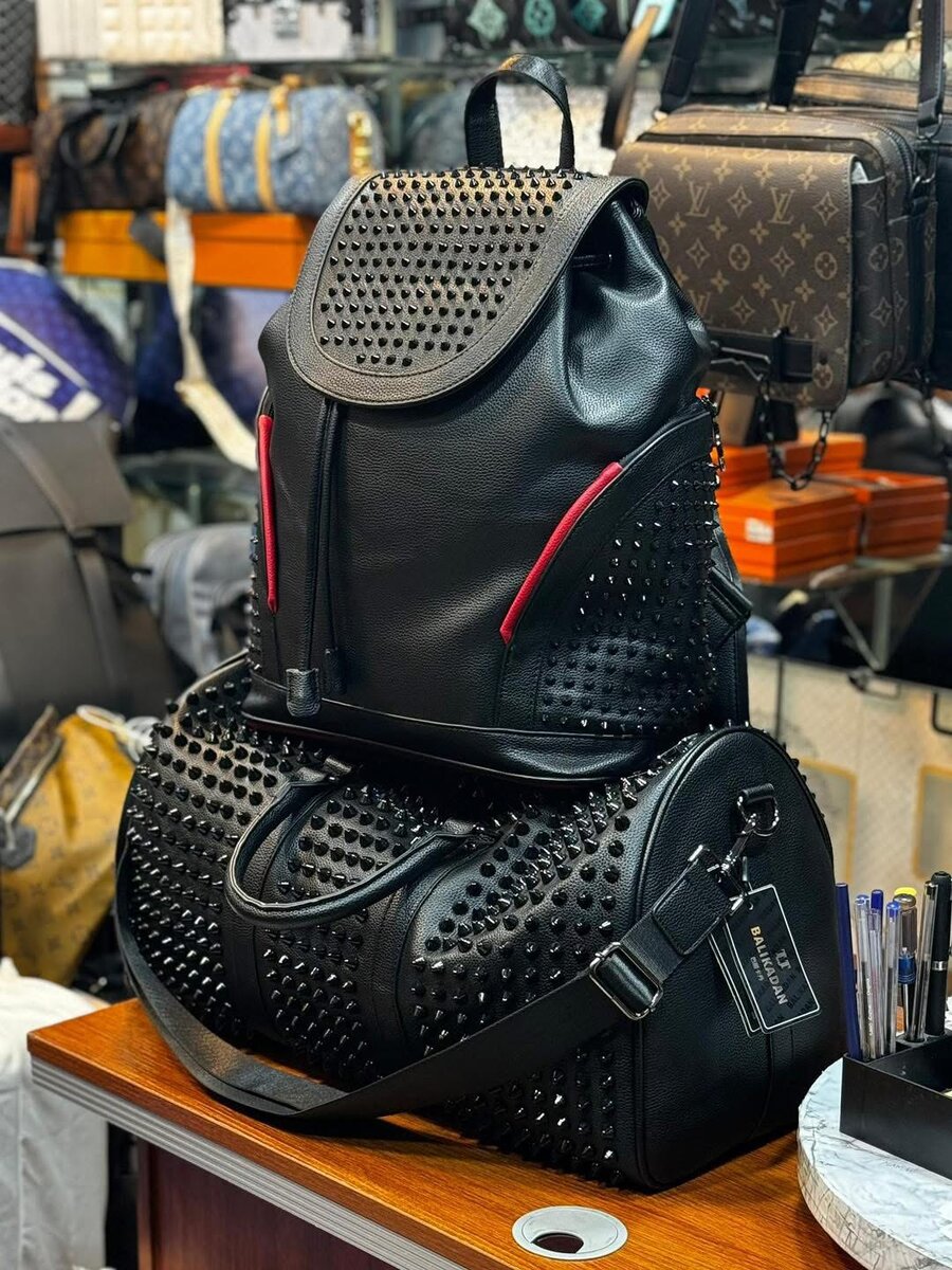 Découvrez cet ensemble moderne et élégant, combinant un sac à dos et un sac week-end en cuir noir clouté. Idéal pour les voyages et le quotidien, il allie style audacieux et fonctionnalité. Parfait pour ceux qui cherchent à se démarquer tout en gardant leurs affaires organisées.