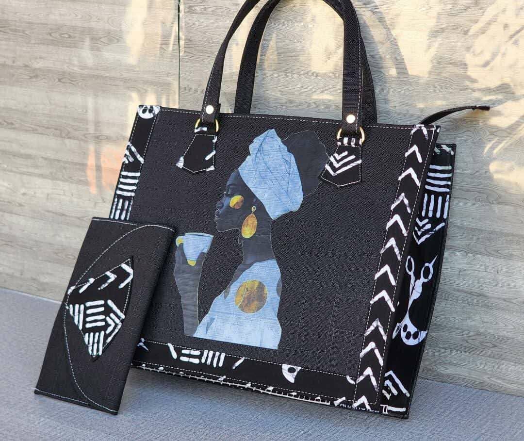 La face avant est dominée par une grande illustration colorée représentant une femme au style contemporain, avec des papillons et peut-être des tatouages. Cette image apporte un caractère unique et artistique au sac.