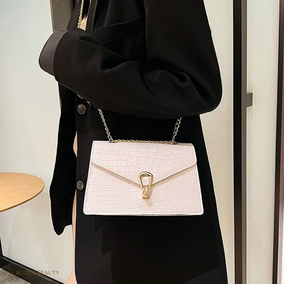 Ce sac à main blanc glamour avec motif crocodile et chaîne dorée est parfait pour un usage quotidien ou des occasions spéciales. Compact et chic avec fermeture sécurisée, il ajoute du style à toute tenue.