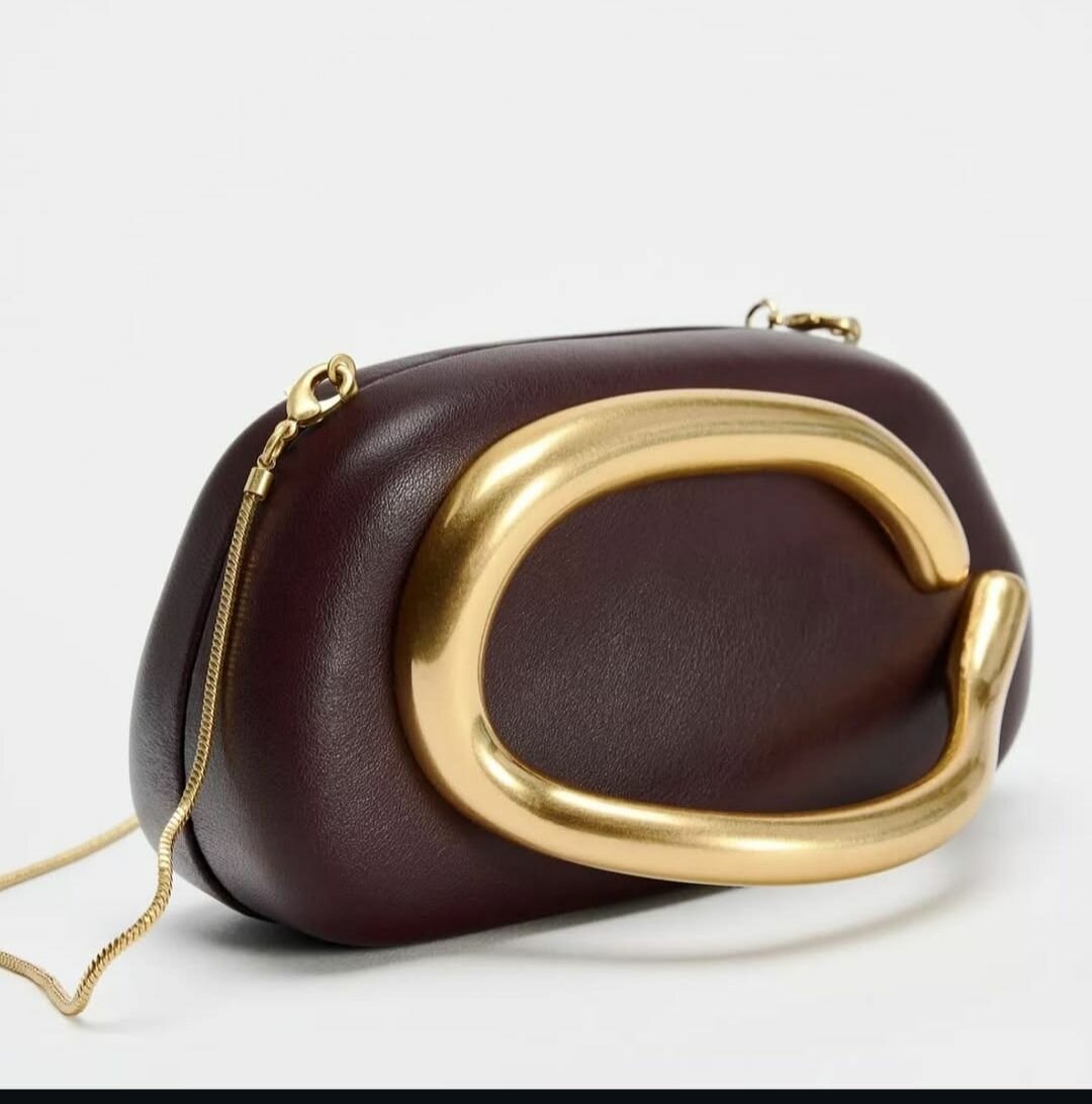Embellissez votre tenue avec ce sac à main en cuir marron, orné d'une élégante poignée dorée. Idéal pour les événements chics, ce sac se porte à l'épaule grâce à sa chaîne subtile. Combine élégance et fonctionnalité pour un look raffiné.