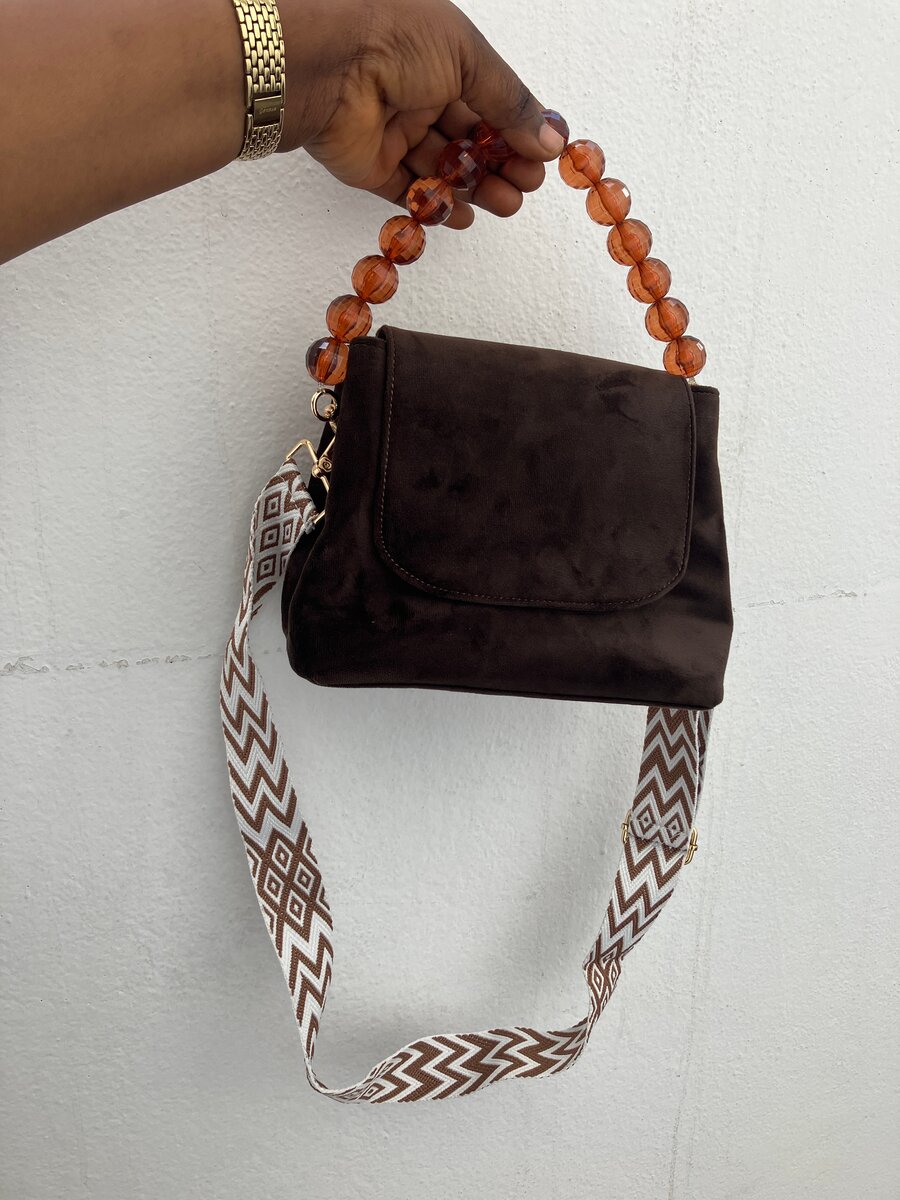 Ajoutez une touche de sophistication à votre tenue avec ce sac à main en velours. Parfait pour une sortie chic, il est doté d'une poignée en perles colorées et d'une bandoulière ajustable en motifs géométriques pour un confort optimal. Idéal pour transporter vos essentiels avec style.