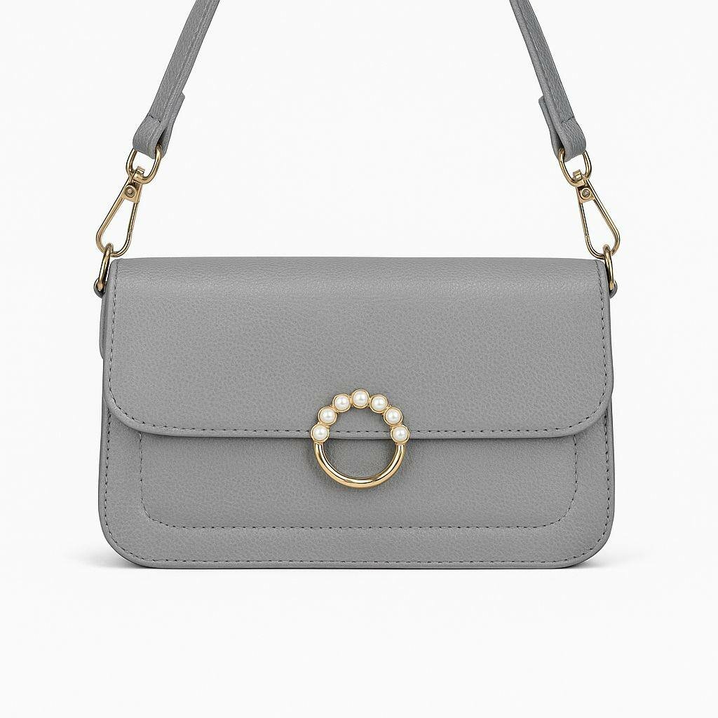 Ce sac à main sophistiqué en cuir gris est l'ajout parfait à votre garde-robe. Avec sa fermeture décorée de perles élégantes, il offre un style intemporel et chic. Idéal pour toutes vos sorties, il complètera vos tenues avec finesse.