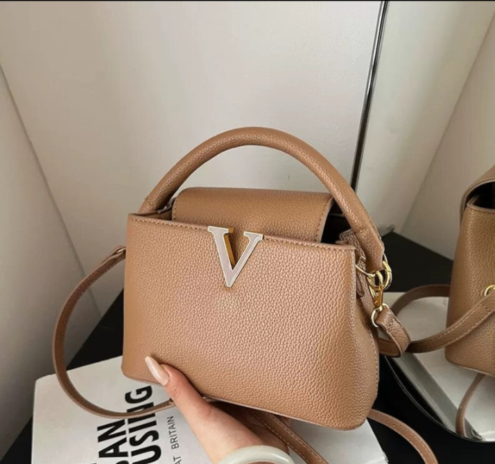 Sac à main en cuir beige élégant avec une lettre V dorée. Design moderne et raffiné, parfait pour une soirée ou une occasion spéciale. Léger et spacieux, il peut contenir l'essentiel.