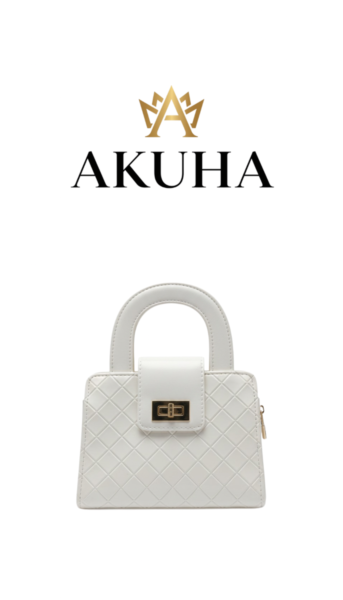 Élégant sac à main Akuha en cuir blanc, parfait pour toutes occasions. Design moderne avec fermeture dorée, idéal pour compléter votre style avec sophistication. Compact et pratique, il s'adapte à vos essentiels quotidiens.