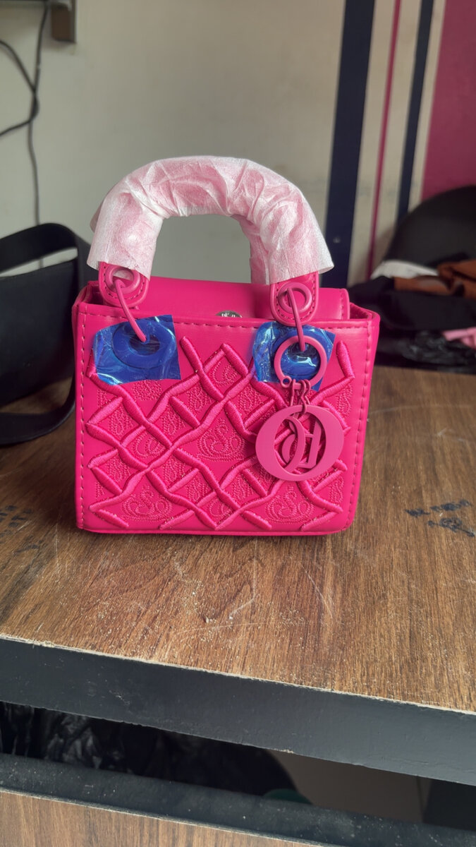 Sac à main en plastique rose avec poignée et détails en bleu. Design inspiré de Dior. Léger et durable. Idéal pour les accessoires de mode et les sorties décontractées.