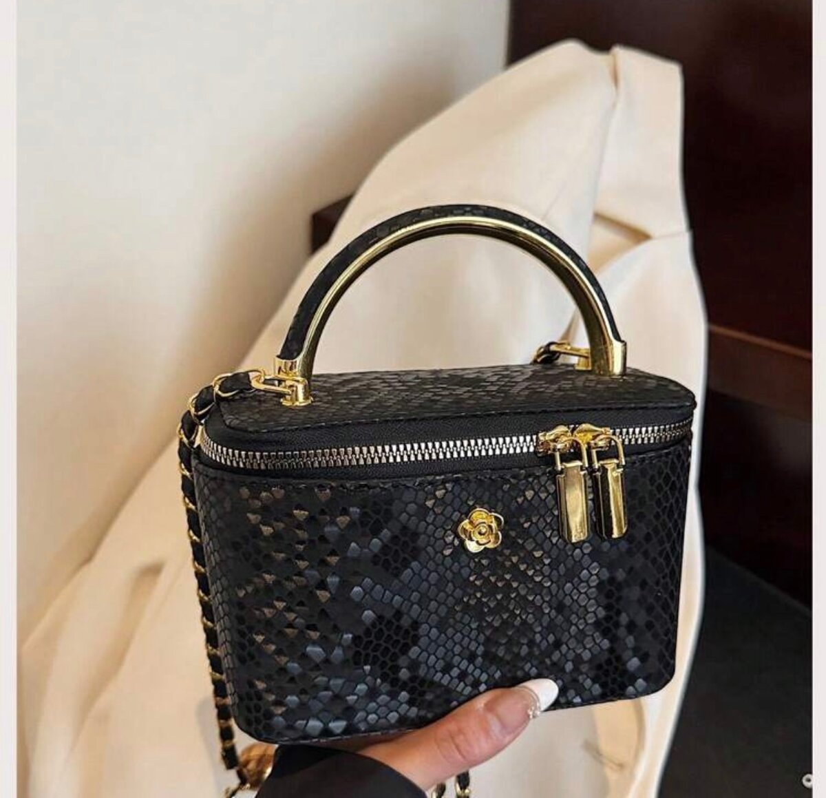 Optez pour ce sac à main tendance en simili cuir avec détails dorés, parfait pour ajouter une touche de sophistication à vos tenues. Compact et élégant, il est idéal pour vos sorties en ville ou soirées spéciales. Dimensions: 17x11x7 cm.
