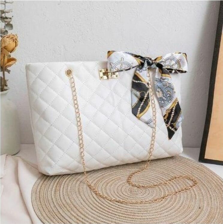 Découvrez ce sac à main blanc matelassé, parfait pour ajouter une touche d'élégance à votre tenue. Avec sa chaîne dorée et son foulard décoratif, il offre un style chic tout en étant pratique pour l'organisation grâce à ses multiples compartiments. Idéal pour les sorties et les occasions spéciales.