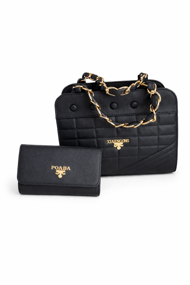 Élégant sac à main noir matelassé avec chaîne en or et pochette assortie. Parfait pour les occasions spéciales ou le quotidien.