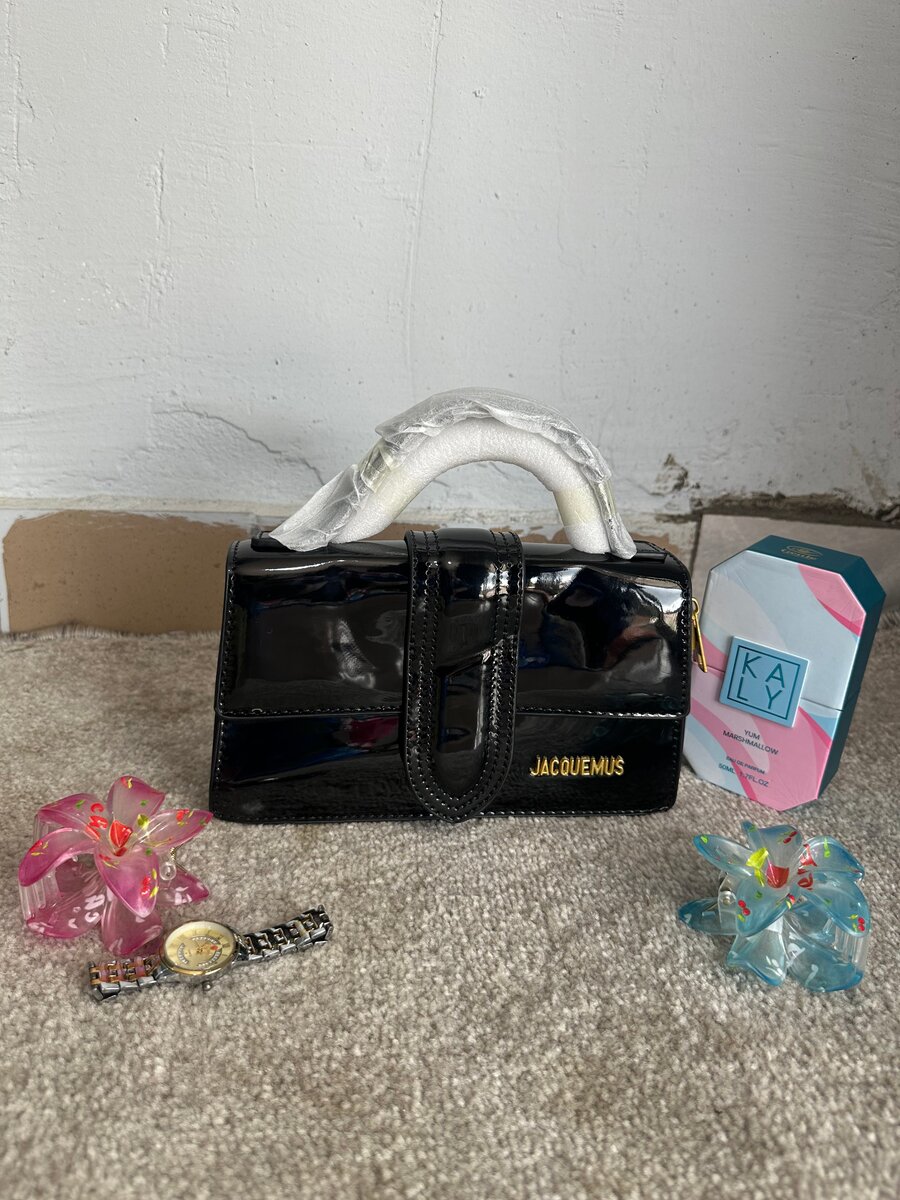 Sac à main noir en cuir verni JACQUEMUS, parfait pour les femmes élégantes. Design moderne et compact, idéal pour les soirées ou les sorties.