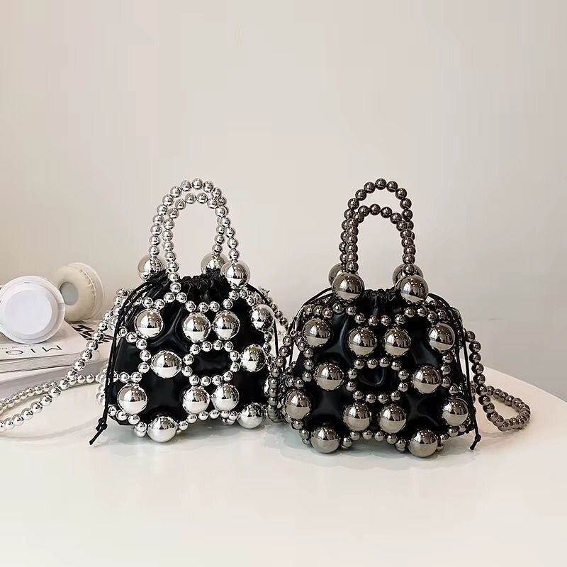 Découvrez ce sac à main unique, orné de perles argentées et d'une chaîne élégante. Parfait pour ajouter une touche chic à vos tenues de soirée. Compact et stylé, il convient à toutes vos sorties.