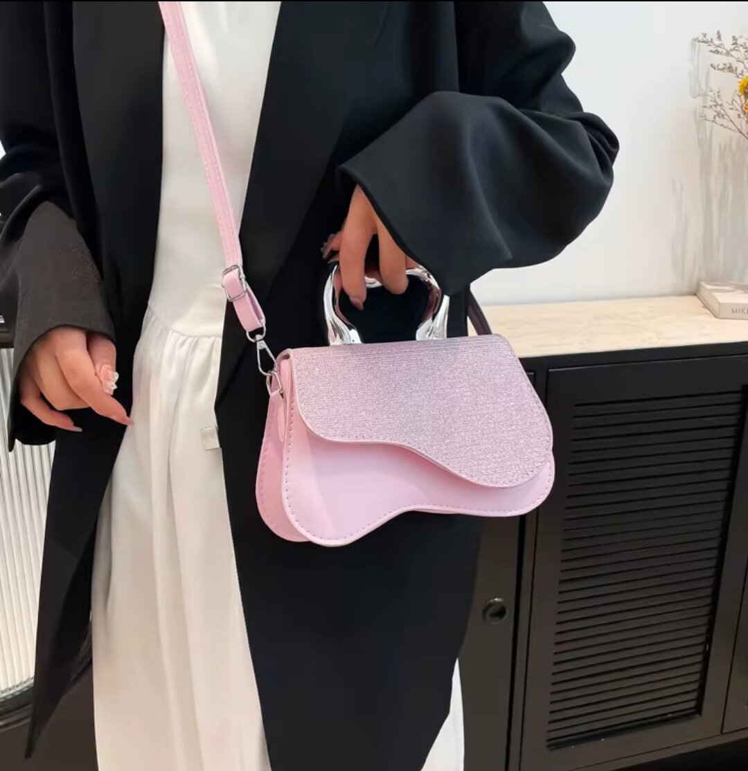 Ajoutez une touche de glamour à votre tenue avec ce sac à main rose étincelant. Doté d'une poignée argentée en forme de cœur et d'une bandoulière amovible, il est parfait pour les soirées ou une virée shopping décontractée.