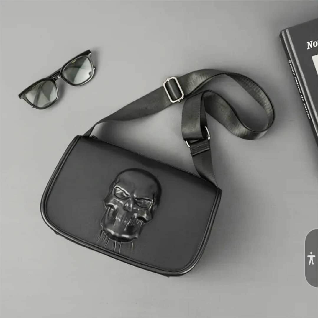 Adoptez un look audacieux avec ce sac bandoulière noir décoré d'un crâne. Parfait pour ceux qui aiment exprimer leur style unique. Conçu pour être à la fois pratique et tendance, il dispose d'une sangle ajustable pour un confort optimal. Idéal pour les sorties décontractées ou les soirées en ville. Soyez prêt à impressionner!