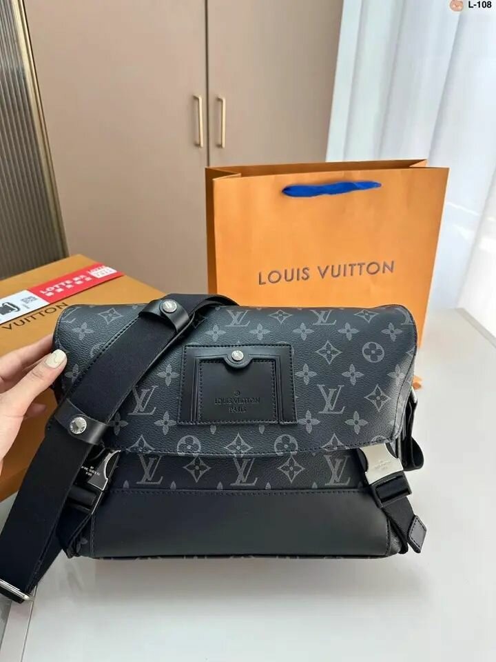 Sac bandoulière Louis Vuitton en cuir noir avec motif monogramme. Conçu pour les hommes, ce sac est élégant et fonctionnel, parfait pour un usage quotidien. Il comporte des fermetures éclair robustes et des détails en cuir de haute qualité.