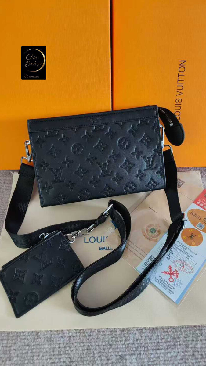 Sac bandoulière Louis Vuitton en cuir noir avec motif embossé. Élégant et pratique, parfait pour un usage quotidien.
