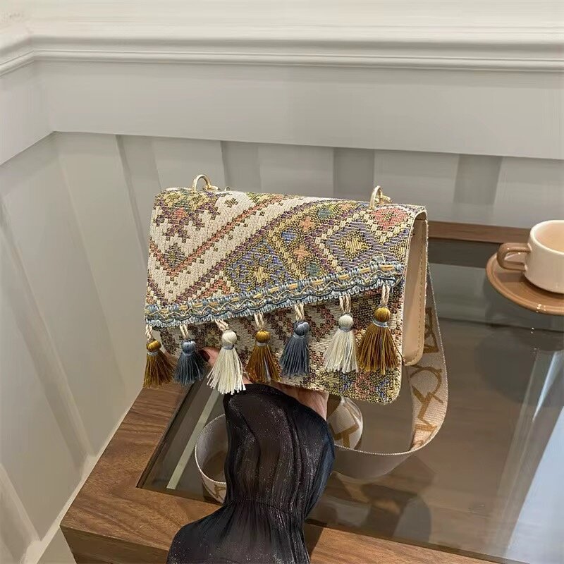 Découvrez notre sac bohème à franges, une pièce unique avec des motifs ethniques et des pompons colorés. Parfait pour apporter une touche originale à votre tenue, ce sac est idéal pour les sorties en ville ou les événements spéciaux. Fabriqué avec soin, il offre une grande capacité de rangement et une sangle réglable pour un confort optimal. Adoptez le style bohème chic !