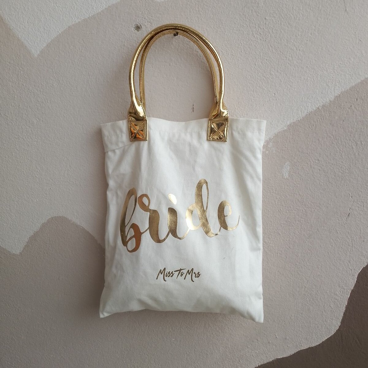 Ce magnifique sac "Bride" Miss to Mrs est parfait pour la future mariée. Fabriqué en coton de haute qualité avec des poignées dorées élégantes. Idéal pour un cadeau de shower de mariage ou pour transporter les essentiels du jour J.