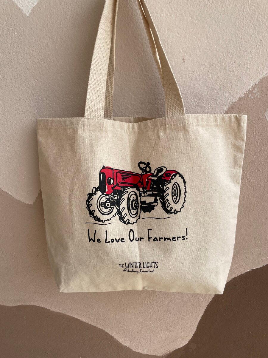 Sac cabas en coton avec imprimé coloré "Nous aimons nos agriculteurs!". Idéal pour le shopping ou une sortie au marché, ce sac est robuste et élégant. Emportez partout vos essentiels avec style.