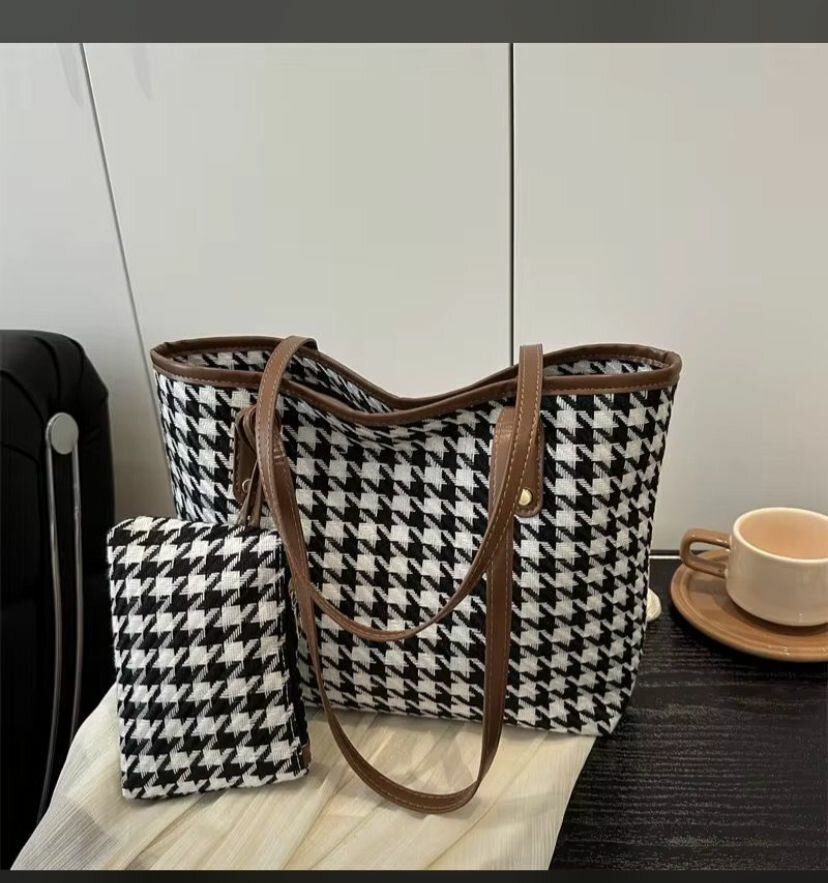 Découvrez notre élégant sac cabas en motif pied-de-poule, parfait pour un style chic et décontracté. Fabriqué avec des matériaux de haute qualité, ce sac est doté de poignées en cuir synthétique pour un confort optimal. Idéal pour le quotidien, il propose un grand espace de rangement et inclut une pochette assortie. Un choix parfait pour les sorties en ville ou le travail.