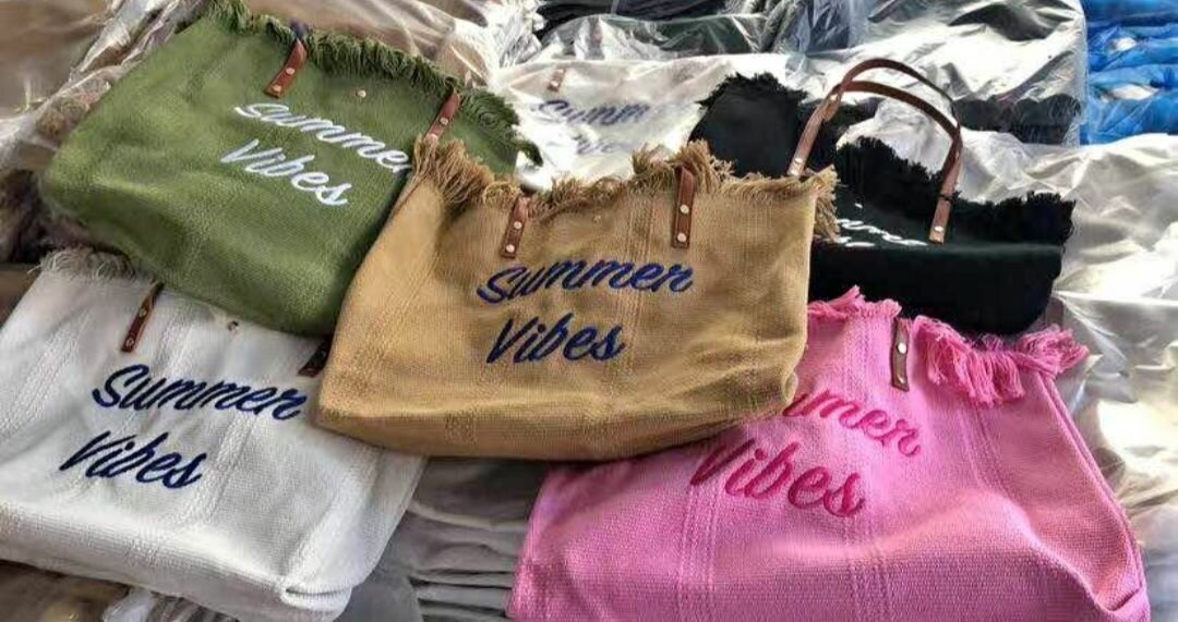Sac cabas en toile avec franges et bandoulière en cuir. Imprimé 'Summer Vibes'. Idéal pour la plage ou les sorties décontractées. Disponible en plusieurs couleurs.