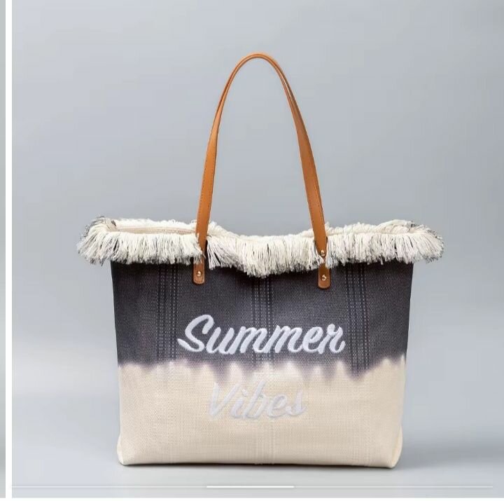 Sac cabas en toile avec poignées en cuir, décoration frangée. Parfait pour la plage ou les sorties d'été. Léger et spacieux, disponible en plusieurs coloris.