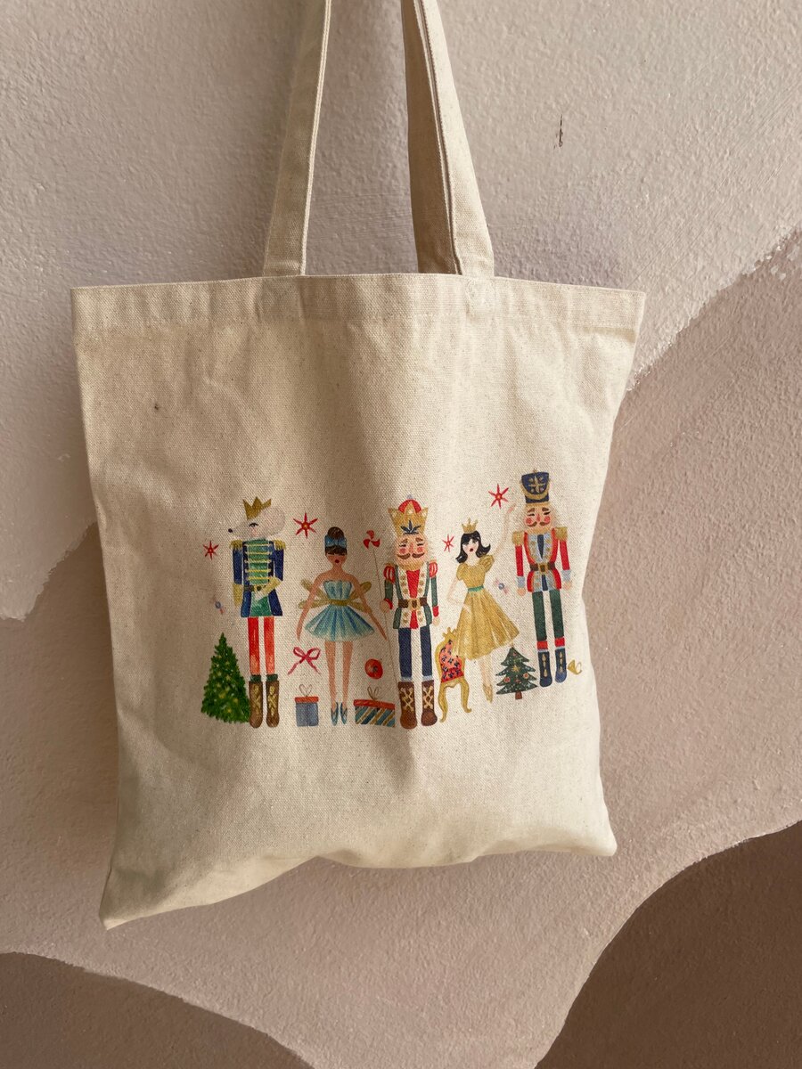 Sac cabas en toile avec impression de soldats de bois pour Noël. Léger et pratique, idéal pour les courses ou comme cadeau.