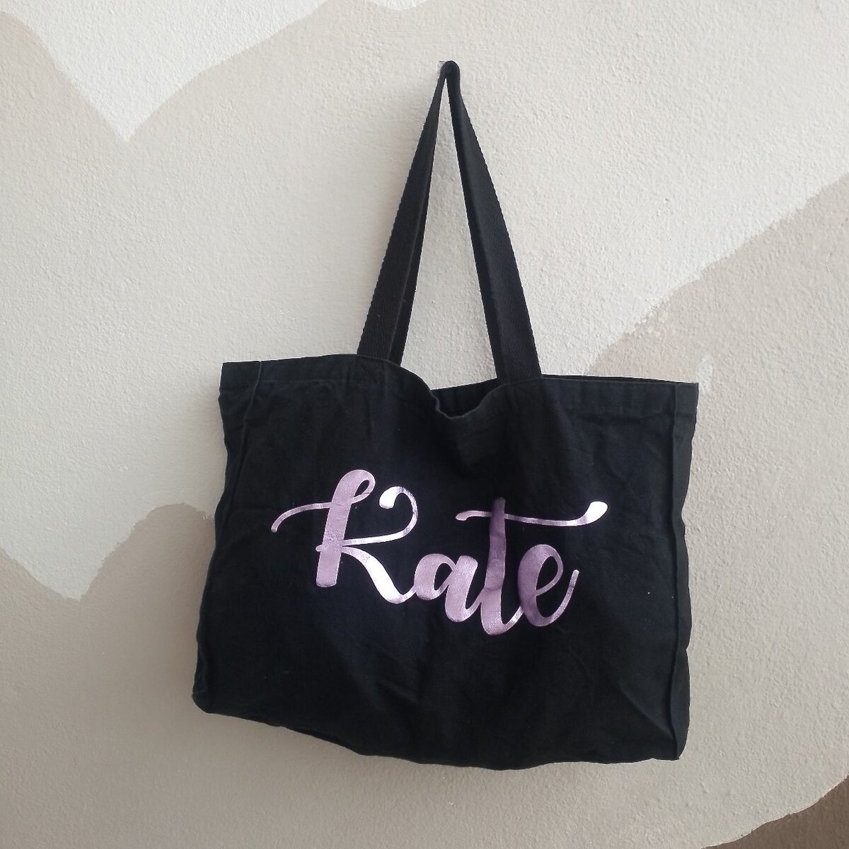 Ce sac cabas en toile noire est idéal pour vos courses ou sorties décontractées. Son design personnalisé avec le prénom 'Kate' ajoute une touche unique et élégante. Pratique et spacieux, il est fait pour durer avec des anses robustes.